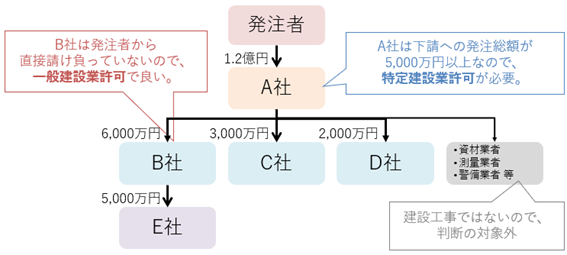 ここで注意をいただきたいのは、特定建設業許可を有する建設業者(以下、特定建設業者)は一般建設業許可を有する建設業者(以下、一般建設業者)であっても、請負代金の金額に制限はない、という点です。一般建設業者であっても、発注者から直接工事を請け負った場合(元請となった場合)に、下請に出す代金に制限がかかっているのみで、請負金額の制限はありません。