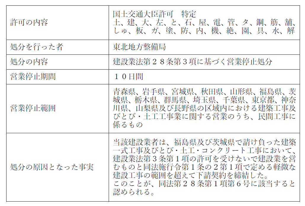 本件の事例に戻りますと、A社は許可を持っており無許可営業はしていませんが、「無許可業者への下請発注」をしたことで処分を受けました。建設業法では、無許可業者に対する罰則だけでなく、許可を持って営んでいても無許可業者へ下請発注をすると建設業法第28条に基づき監督処分が科されます。